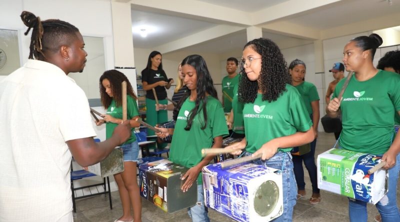 Nesta segunda-feira (29), os jovens quissamaenses vinculados ao Programa de Educação Ambiental, Ambiente Jovem, tiveram uma oportunidade de confeccionar instrumentos musicais e aprender sobre os ritmos de percussão. O percussionista Anderson Dada ensinou aos jovens como utilizar os instrumentos com materiais recicláveis.