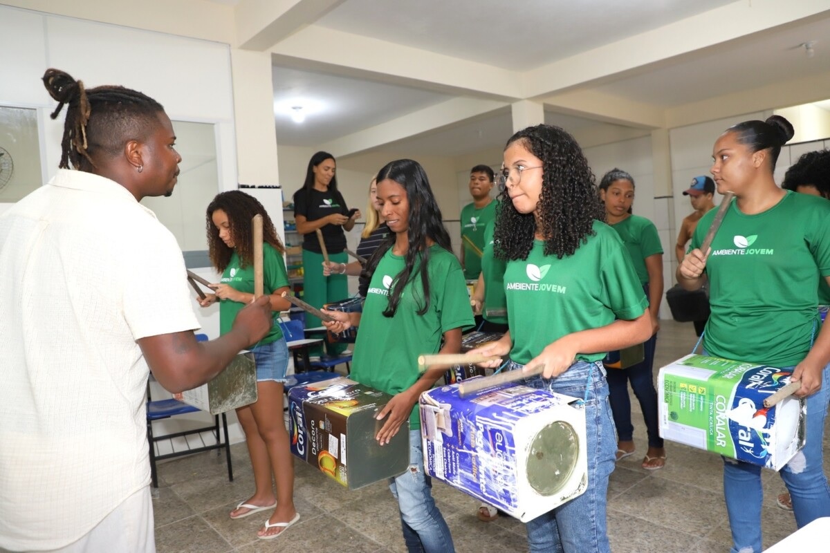 Nesta segunda-feira (29), os jovens quissamaenses vinculados ao Programa de Educação Ambiental, Ambiente Jovem, tiveram uma oportunidade de confeccionar instrumentos musicais e aprender sobre os ritmos de percussão. O percussionista Anderson Dada ensinou aos jovens como utilizar os instrumentos com materiais recicláveis.