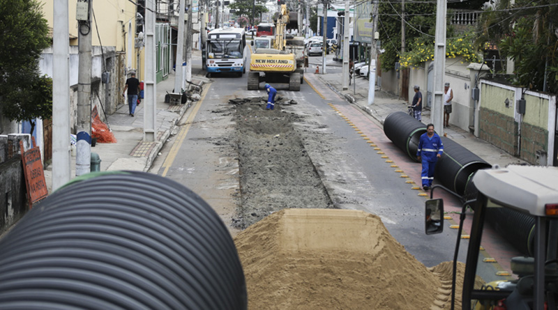 A secretaria municipal de Infraestrutura e Mobilidade Urbana realiza obras de reparo no sistema de drenagem de um trecho da Rua Sete de Setembro, entre a Rua Gonçalves Dias e a Rua Riachuelo, entre o bairro da Lapa e o Parque Califórnia. Homens e máquinas trabalham na substituição da tubulação de 900 milímetros para esgotamento de águas pluviais, que vinha apresentando problemas.
