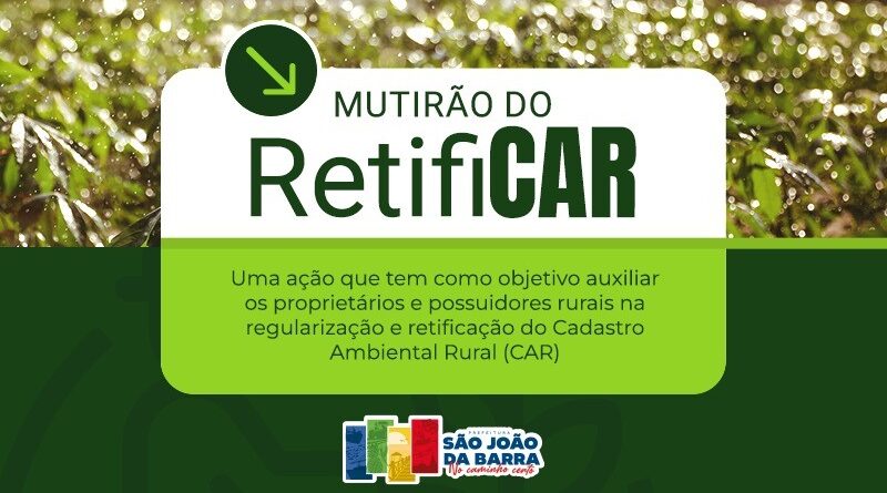 O Mutirão Retificar acontece na próxima terça-feira, 26, das 10h às 17h, na Secretaria de Meio Ambiente de São João da Barra – Rua Joaquim Thomaz de Aquino Filho, 80, Centro. O objetivo é auxiliar os proprietários e os possuidores rurais na regularização e retificação do Cadastro Ambiental Rural (CAR), oferecendo orientações técnicas e suporte para corrigirem, atualizarem ou complementarem seus cadastros.