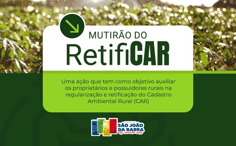 O Mutirão Retificar acontece na próxima terça-feira, 26, das 10h às 17h, na Secretaria de Meio Ambiente de São João da Barra – Rua Joaquim Thomaz de Aquino Filho, 80, Centro. O objetivo é auxiliar os proprietários e os possuidores rurais na regularização e retificação do Cadastro Ambiental Rural (CAR), oferecendo orientações técnicas e suporte para corrigirem, atualizarem ou complementarem seus cadastros.