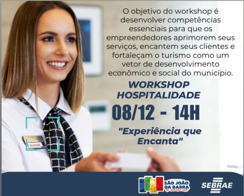 O Workshop de Hospitalidade – Experiência que Encanta acontece em São João da Barra no dia 8 de dezembro, no auditório municipal, das 14h às 18h. A realização é da Prefeitura, por meio da Secretaria de Turismo e Lazer e em parceria com o Sebrae, tendo como público-alvo empreendedores, comerciantes e profissionais do setor turístico. A inscrição, gratuita, pode ser feita no link (aqui).